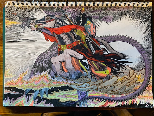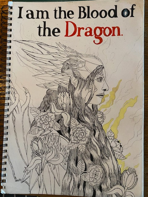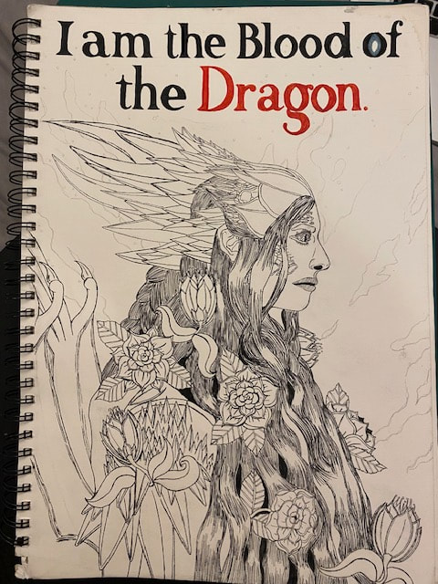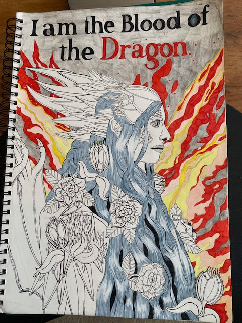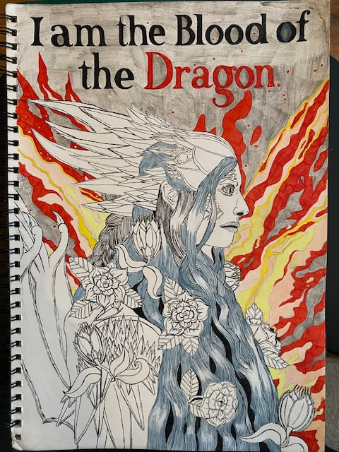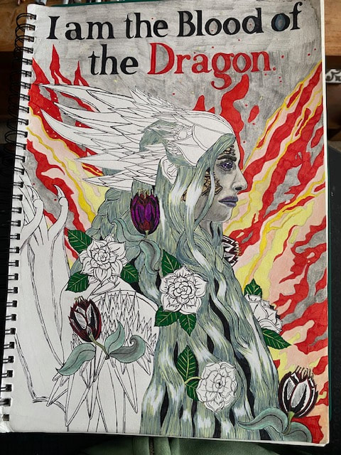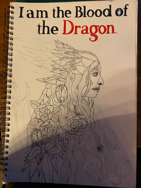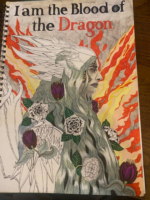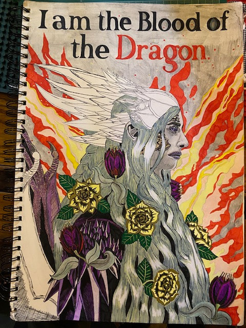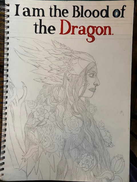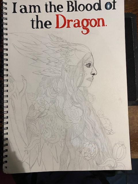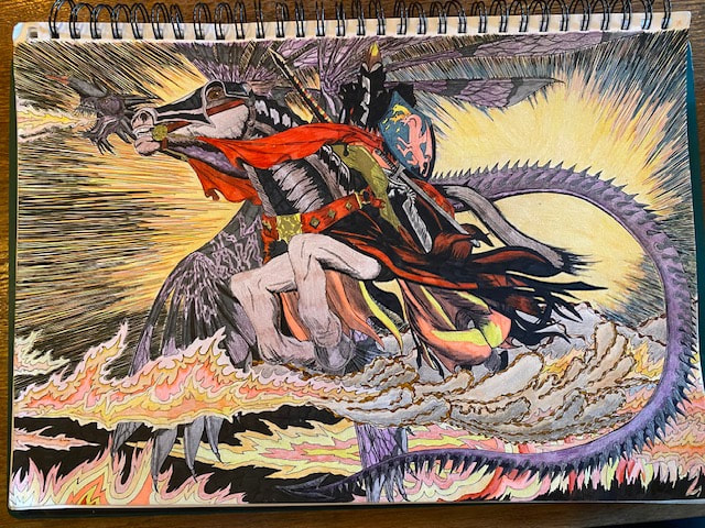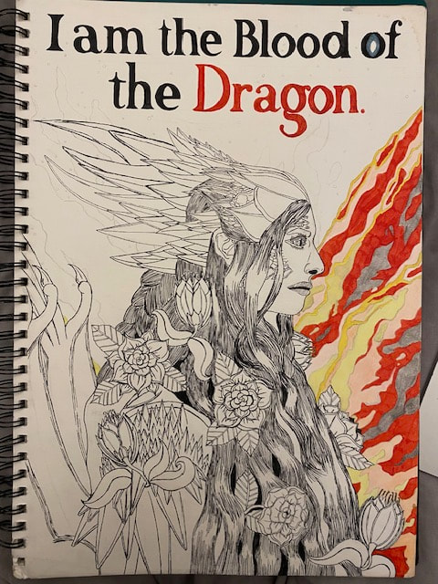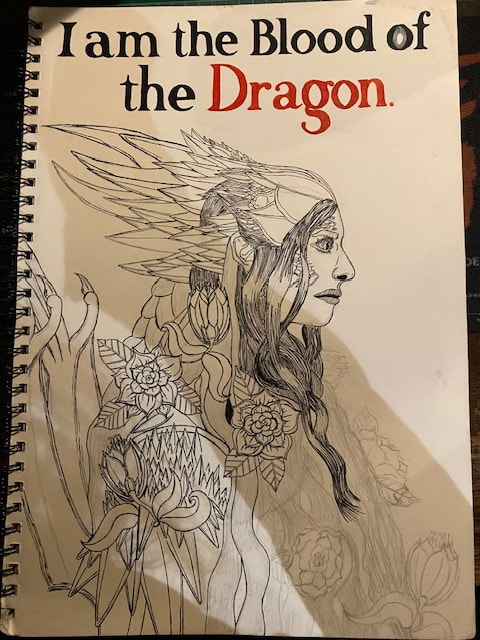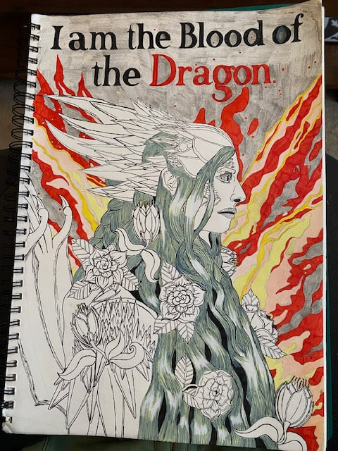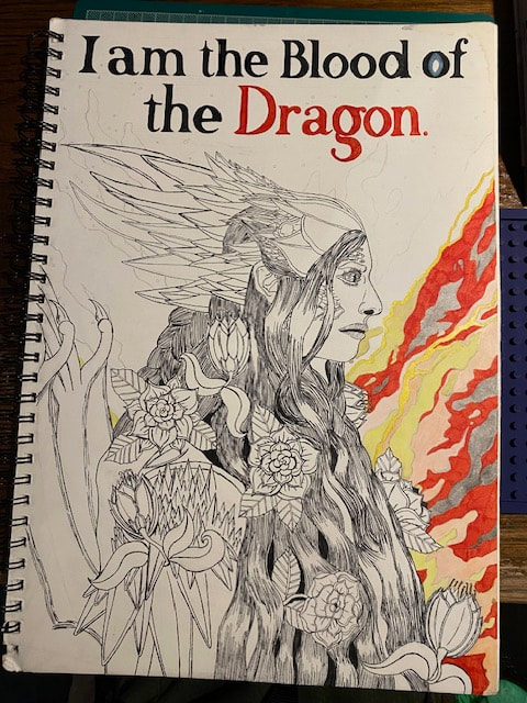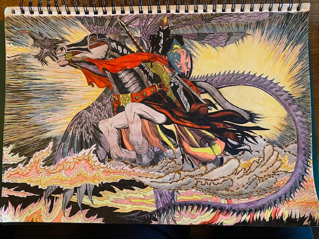 While I was in the middle of working on drawing a dragon for Cory's step-son, someone else wanted me to do a drawing. I work on my shift at the Silverdale hotel, someone I work in the kitchen named Nadia wanted a drawing. When she asked me, I thought at first what Nadia wanted was for her child but it's for her instead. What Nadia wanted was something strange (from Mythology, science fiction or fantasy), I wasn't sure what kind of strange she was looking for, but when I'd some time for myself she saw me working on the drawing I was doing for Cory's step-son, so Nadia asked me to do something similar to the drawing I was on. When I was finished with that drawing, I went straight to work on the drawing for her and I found an image which I think would make a challenge to try. Image of the Dragon: Why I think in trying to draw from this image that it's all in bold colours, with no out lines and tonal/shading in the dragon and figures (at the bottom of the image). Photos of progress: This project took me over a week, with all the spare time I had from anything else. I think Nadia is going to love with what I got for her. But first, I have one more surprise to go with the drawing... The Final Drawing of the Dragon: It's has been a busy and crazy summer, I've been working around the clock on my work shifts and helping my parents in tidying the driveway and garden (including painting anything that was made of wood) for a friend whose wedding "believe it or not", is taking place at my home. A few months before the wedding event took place my friend Cory and his eight year old, step-son Harry have both been asking me to drawing a dragon. When I was free from work and other drawings I'd work on I asked Harry on what kind of dragon is he looking for and he said he's looking for a dragon coloured blue with blue flames out of it's mouth. With that in mind I get started on the drawing. Photos in Progress: I took a lot of thought and looking for what kind of dragon I use to draw, and then I remembered something, in the famous tv program "Game of Thrones", there were three dragon through the entire series hatching from well good-sized eggs, to fully grown monsters, till near the end of the series one of them was killed and part of the army of the dead. So that is what I referenced from along with the house sigil from the same tv program (the three-headed Dragon, of House Targaryen). The final drawing of the Three-headed, Undead Dragon: This took a lot of spare time and a lot of effort in getting the drawing as I can for Harry to have, what took like-forever was the amount of snow falling around the dragon (to make sure that they're visibly white to see) and what was a little tricky was in order to make this dragon look an undead dragon, I had to draw from head to tail of several open wounds, boned ribs showing and an eye socket sticking out in one of the three-headed dragon. During the wedding after the ceremony and buffet meal, I went to give the drawing to Harry (with Cory and his new wife's blessing). Harry was so happy and having the best day of his life from getting what he wanted.