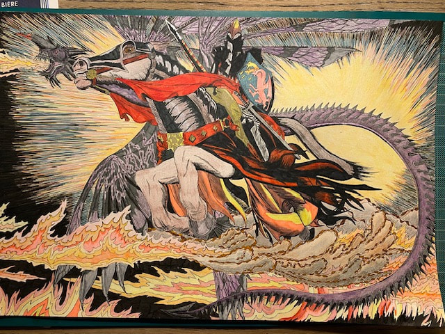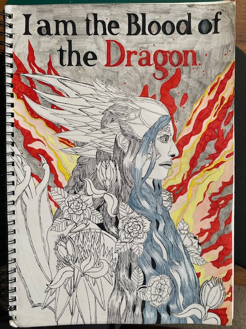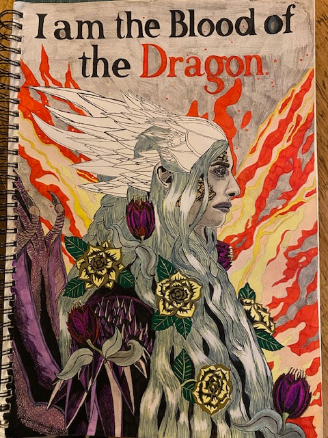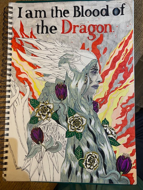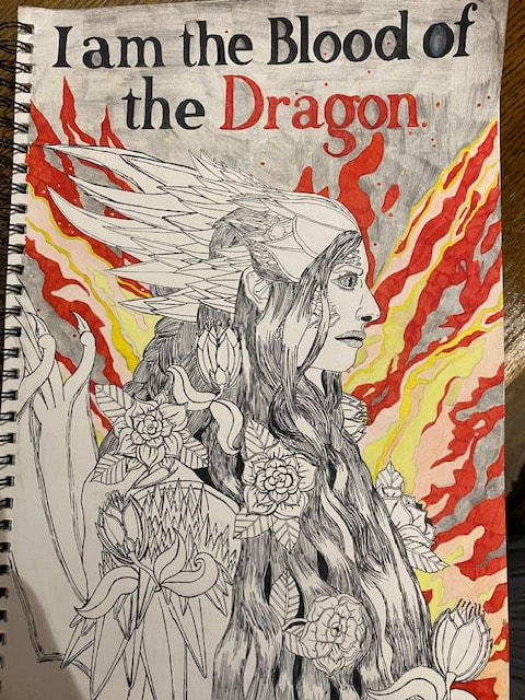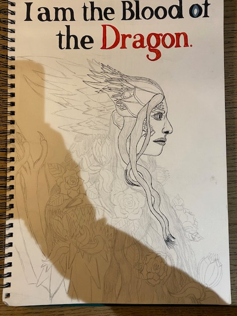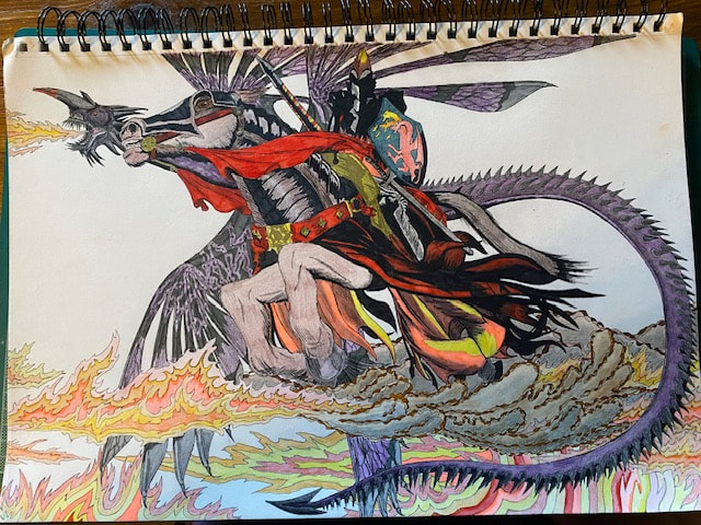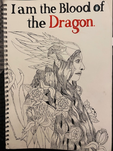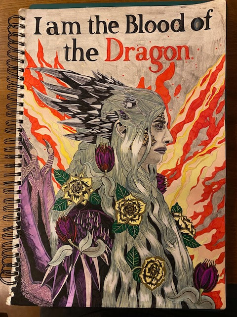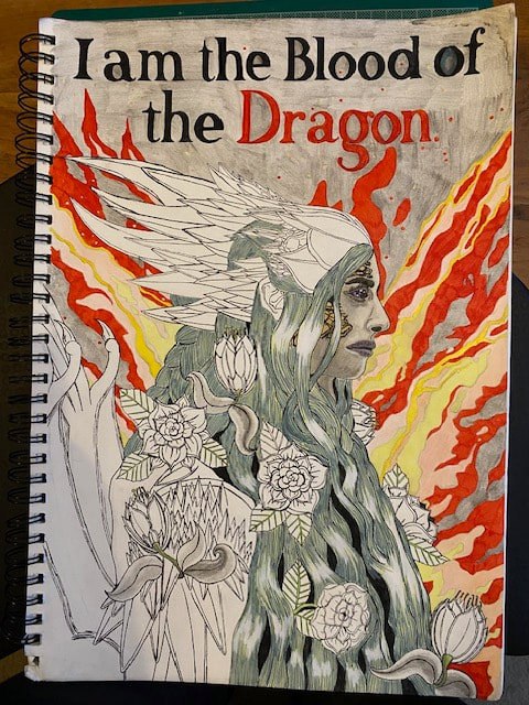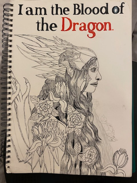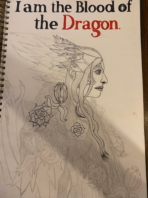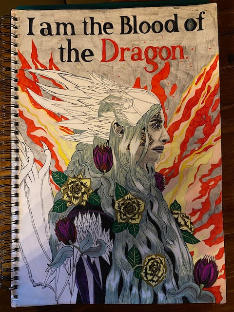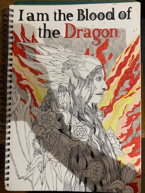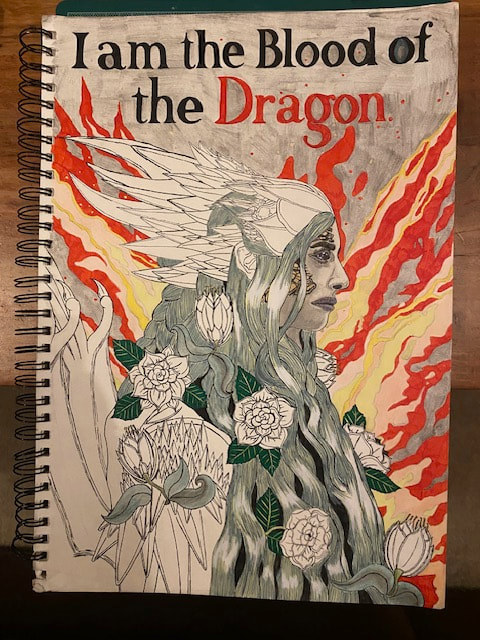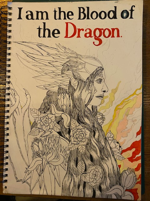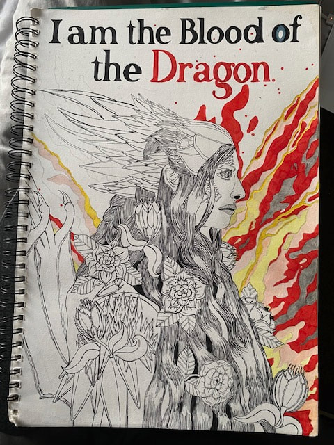 While I was in the middle of working on drawing a dragon for Cory's step-son, someone else wanted me to do a drawing. I work on my shift at the Silverdale hotel, someone I work in the kitchen named Nadia wanted a drawing. When she asked me, I thought at first what Nadia wanted was for her child but it's for her instead. What Nadia wanted was something strange (from Mythology, science fiction or fantasy), I wasn't sure what kind of strange she was looking for, but when I'd some time for myself she saw me working on the drawing I was doing for Cory's step-son, so Nadia asked me to do something similar to the drawing I was on. When I was finished with that drawing, I went straight to work on the drawing for her and I found an image which I think would make a challenge to try. Image of the Dragon: Why I think in trying to draw from this image that it's all in bold colours, with no out lines and tonal/shading in the dragon and figures (at the bottom of the image). Photos of progress: This project took me over a week, with all the spare time I had from anything else. I think Nadia is going to love with what I got for her. But first, I have one more surprise to go with the drawing... The Final Drawing of the Dragon: It's has been a busy and crazy summer, I've been working around the clock on my work shifts and helping my parents in tidying the driveway and garden (including painting anything that was made of wood) for a friend whose wedding "believe it or not", is taking place at my home. A few months before the wedding event took place my friend Cory and his eight year old, step-son Harry have both been asking me to drawing a dragon. When I was free from work and other drawings I'd work on I asked Harry on what kind of dragon is he looking for and he said he's looking for a dragon coloured blue with blue flames out of it's mouth. With that in mind I get started on the drawing. Photos in Progress: I took a lot of thought and looking for what kind of dragon I use to draw, and then I remembered something, in the famous tv program "Game of Thrones", there were three dragon through the entire series hatching from well good-sized eggs, to fully grown monsters, till near the end of the series one of them was killed and part of the army of the dead. So that is what I referenced from along with the house sigil from the same tv program (the three-headed Dragon, of House Targaryen). The final drawing of the Three-headed, Undead Dragon: This took a lot of spare time and a lot of effort in getting the drawing as I can for Harry to have, what took like-forever was the amount of snow falling around the dragon (to make sure that they're visibly white to see) and what was a little tricky was in order to make this dragon look an undead dragon, I had to draw from head to tail of several open wounds, boned ribs showing and an eye socket sticking out in one of the three-headed dragon. During the wedding after the ceremony and buffet meal, I went to give the drawing to Harry (with Cory and his new wife's blessing). Harry was so happy and having the best day of his life from getting what he wanted.