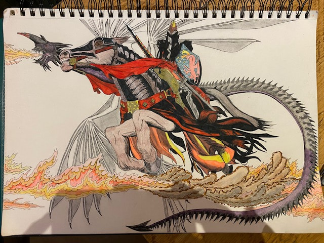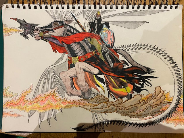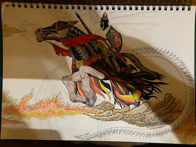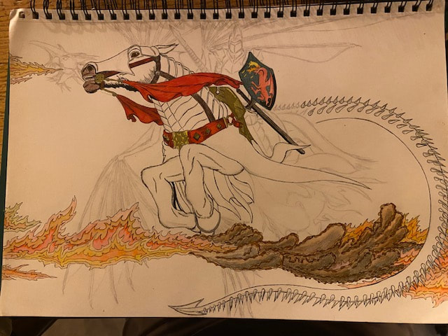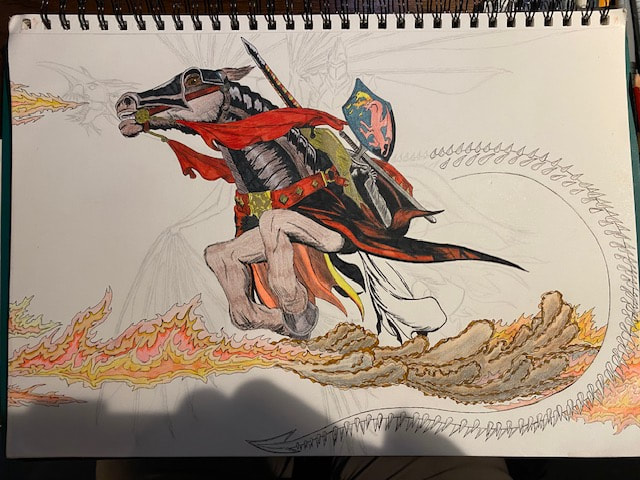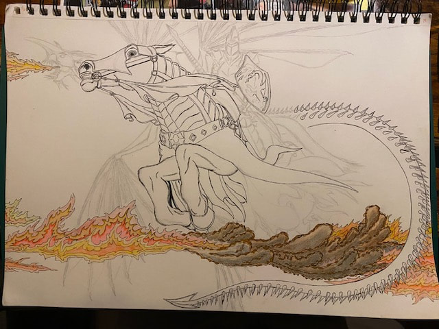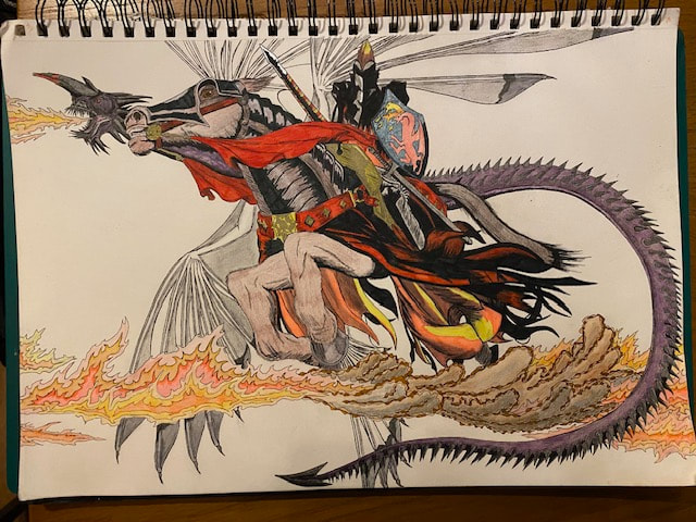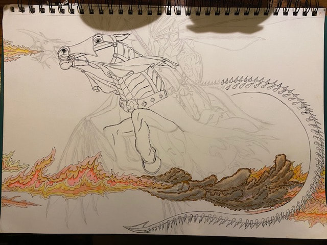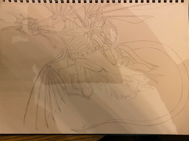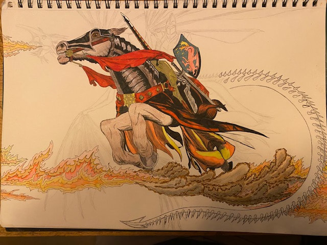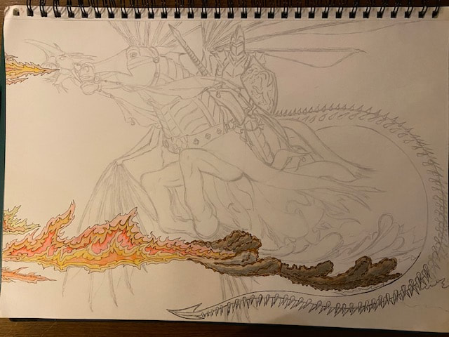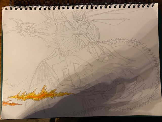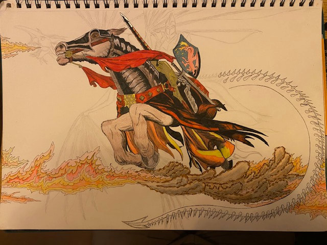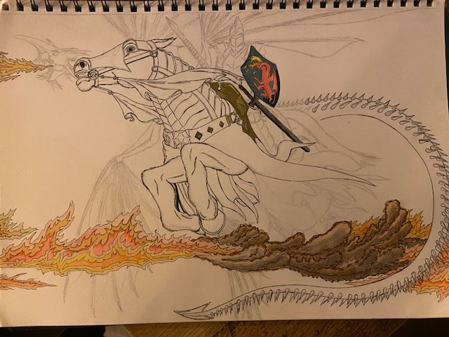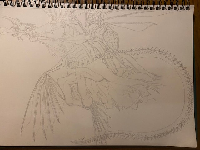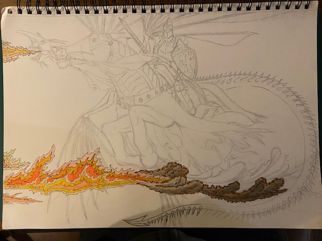 Last year, before winter started and got really cold outside a local in Silverdale named Emma, asked me to created a drawing of a knight in dragon armour similar to the last of drawing of the knight in dragon, but better and in full scale (like from head to toe). With this in mind, I came with an idea of what to, but I had to be a little mix-creativity. Photos in Progress: The Knight, with the hose and armour was referenced and inspired from Aerion Targaryen in the "Game of Thrones where he is charging with a war lance in his hand. As for the dragon was reference from "Avatar: Fire and ash", unlike the other flying creatures (called Banshees) the I used is different and quite fierce, to make it more fierce and dragon-like I added in fire coming out of it's mouth and made the tail longer and spike, so that way the creature more like a proper fire-breathing dragon. I added in more fire in the bottom of the background, of the drawing, along dust and ash as the knight is charging through the fire. The final drawing of the Knight in Dragon armour: After the drawing was done, I waited to bump into Emma while I was at work, then last weekend I was final able to give the drawing to her before she had to go home and I'll be waiting to hear it and her the next time I see her.