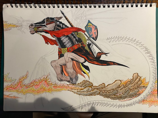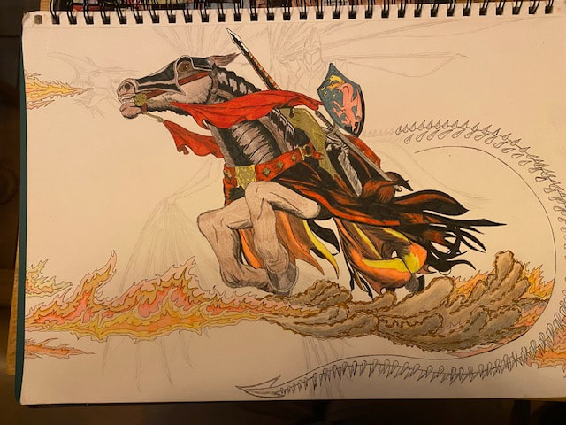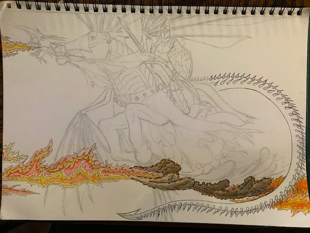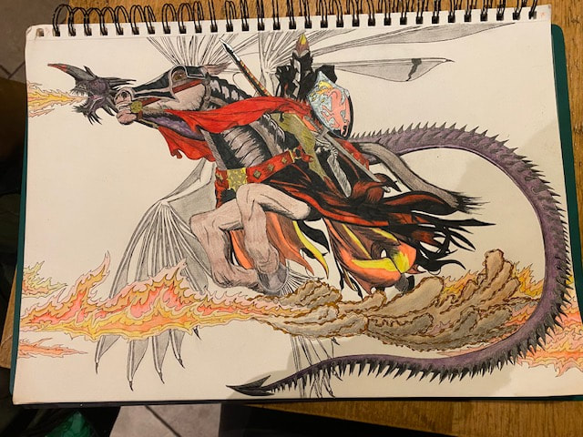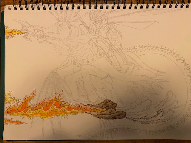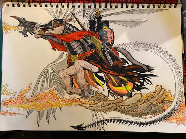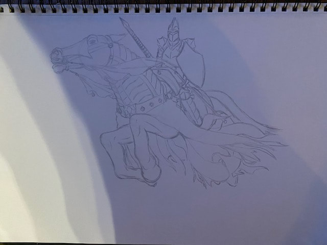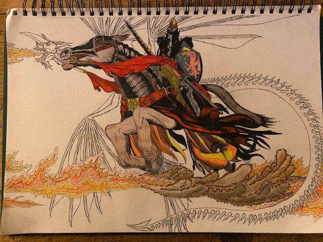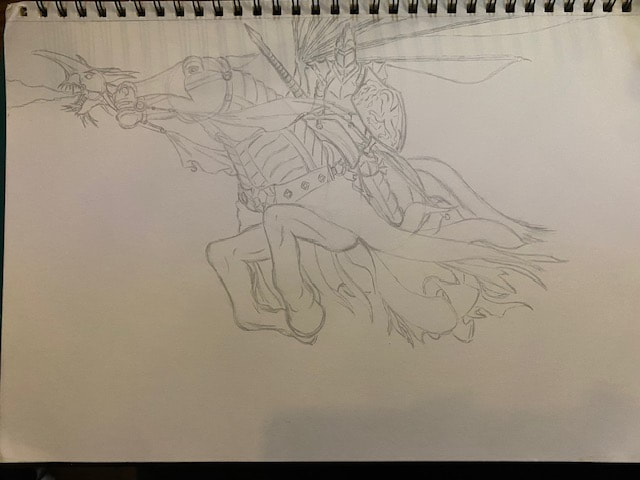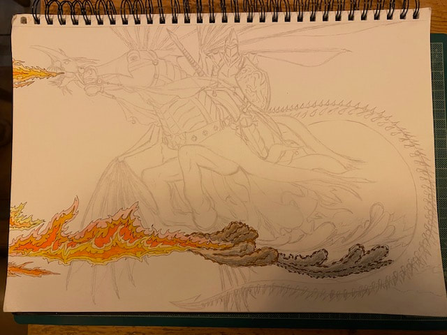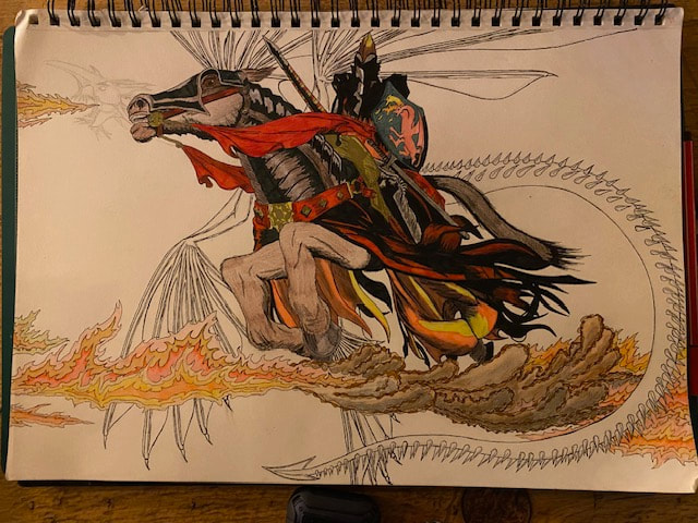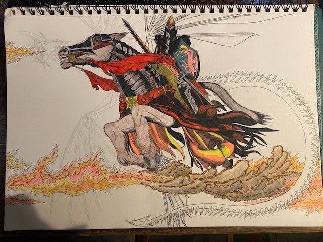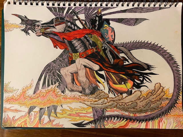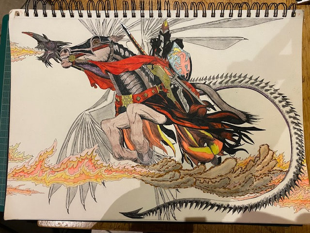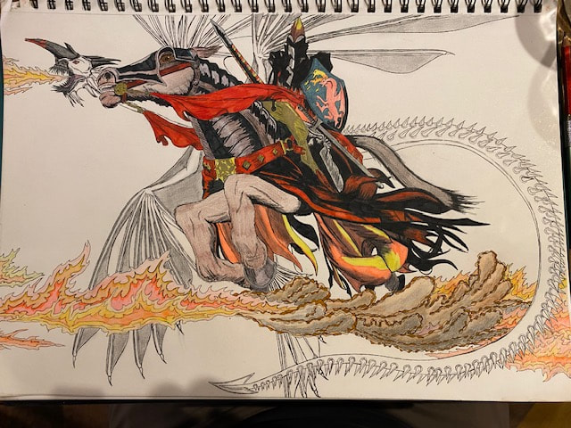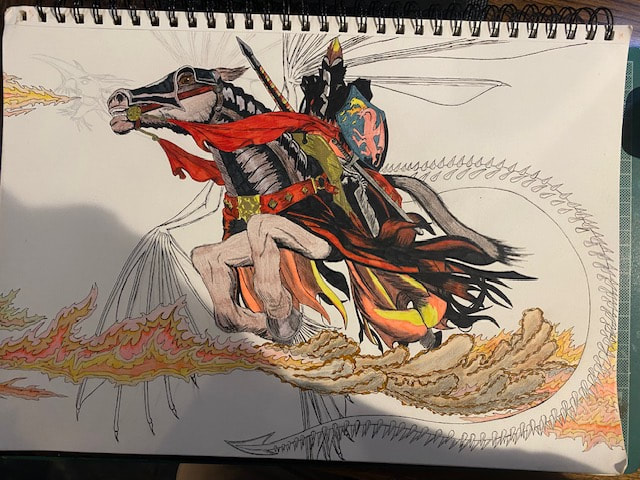 Last year, before winter started and got really cold outside a local in Silverdale named Emma, asked me to created a drawing of a knight in dragon armour similar to the last of drawing of the knight in dragon, but better and in full scale (like from head to toe). With this in mind, I came with an idea of what to, but I had to be a little mix-creativity. Photos in Progress: The Knight, with the hose and armour was referenced and inspired from Aerion Targaryen in the "Game of Thrones where he is charging with a war lance in his hand. As for the dragon was reference from "Avatar: Fire and ash", unlike the other flying creatures (called Banshees) the I used is different and quite fierce, to make it more fierce and dragon-like I added in fire coming out of it's mouth and made the tail longer and spike, so that way the creature more like a proper fire-breathing dragon. I added in more fire in the bottom of the background, of the drawing, along dust and ash as the knight is charging through the fire. The final drawing of the Knight in Dragon armour: After the drawing was done, I waited to bump into Emma while I was at work, then last weekend I was final able to give the drawing to her before she had to go home and I'll be waiting to hear it and her the next time I see her.
