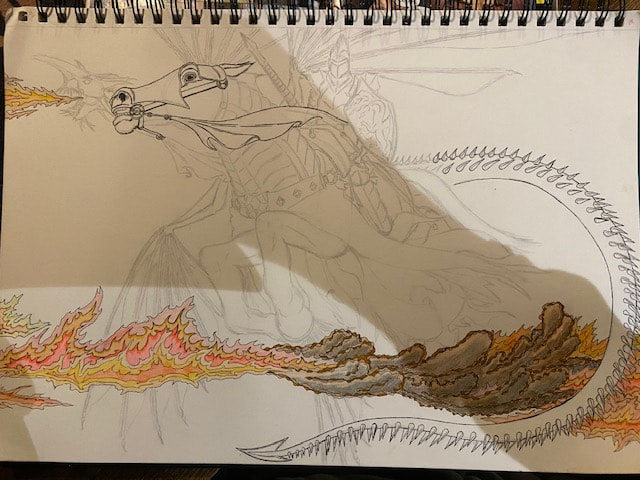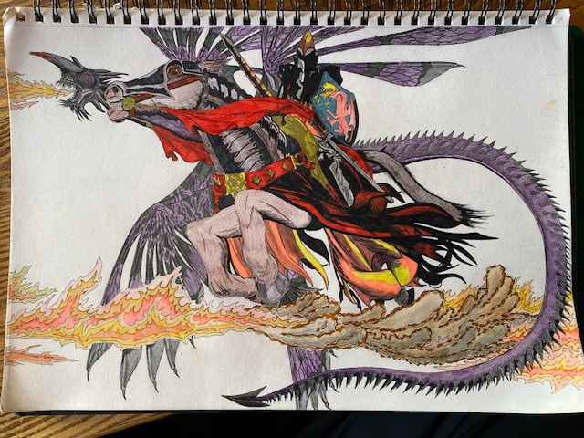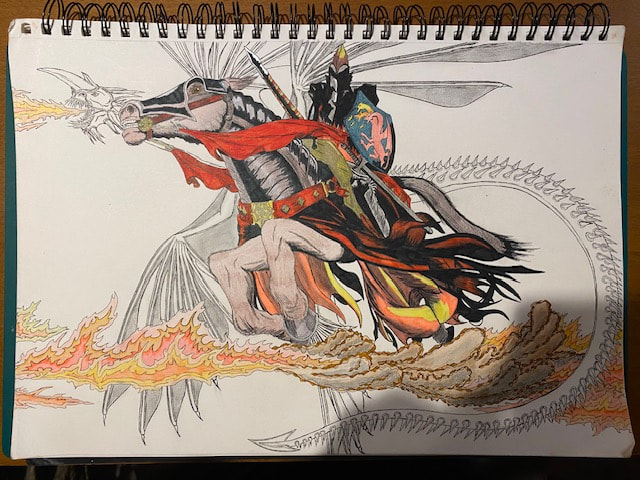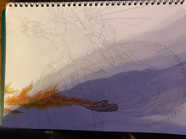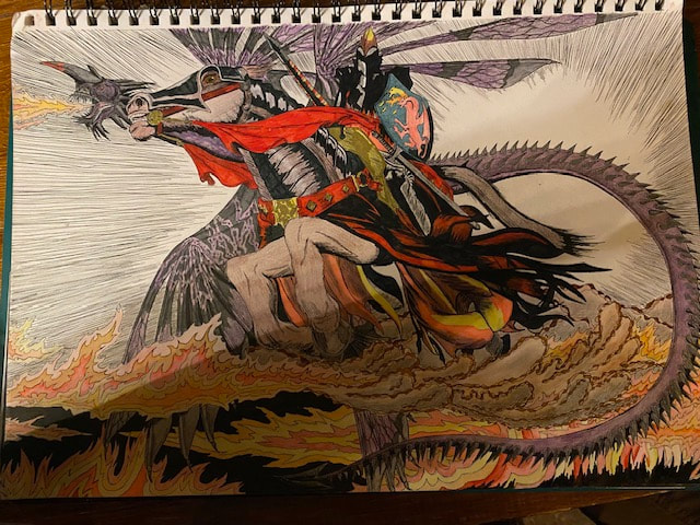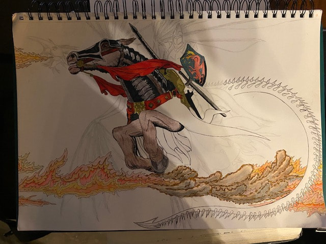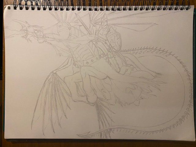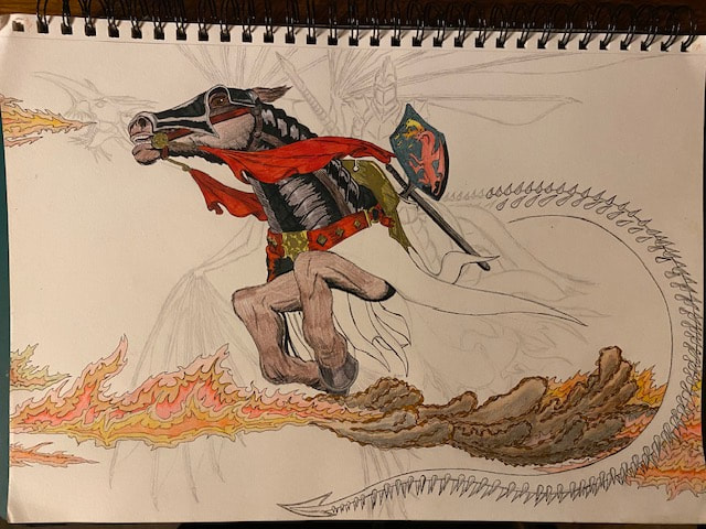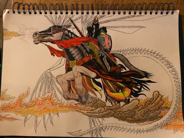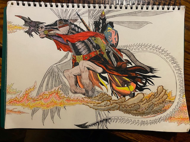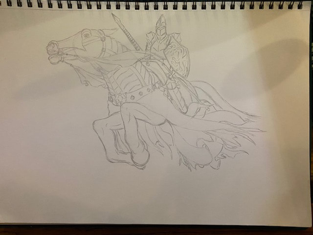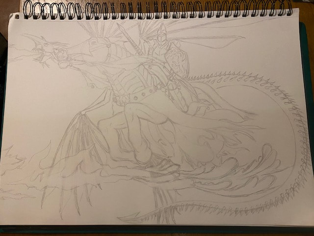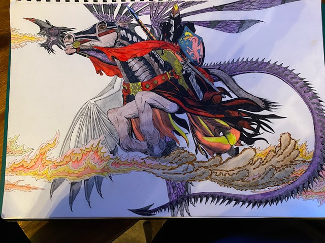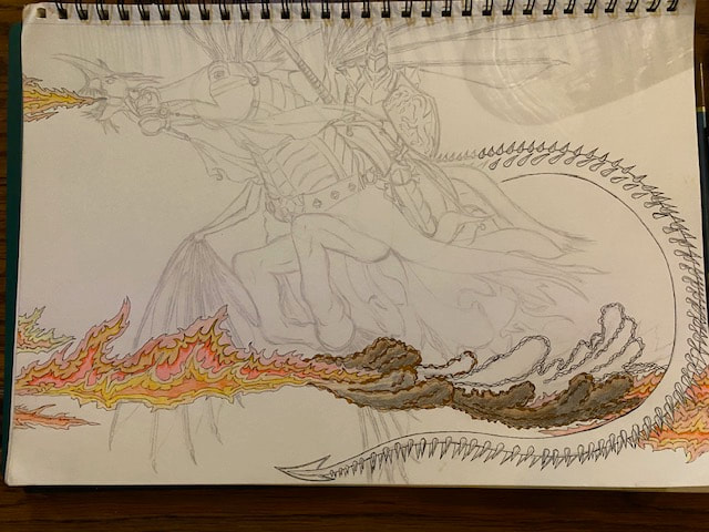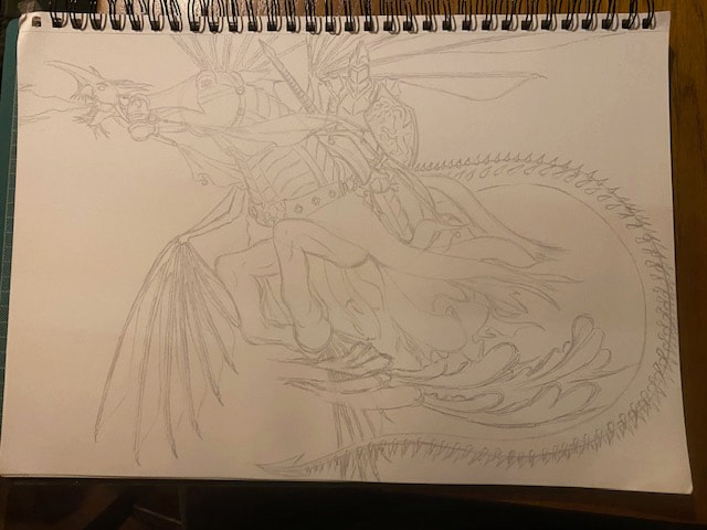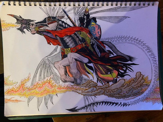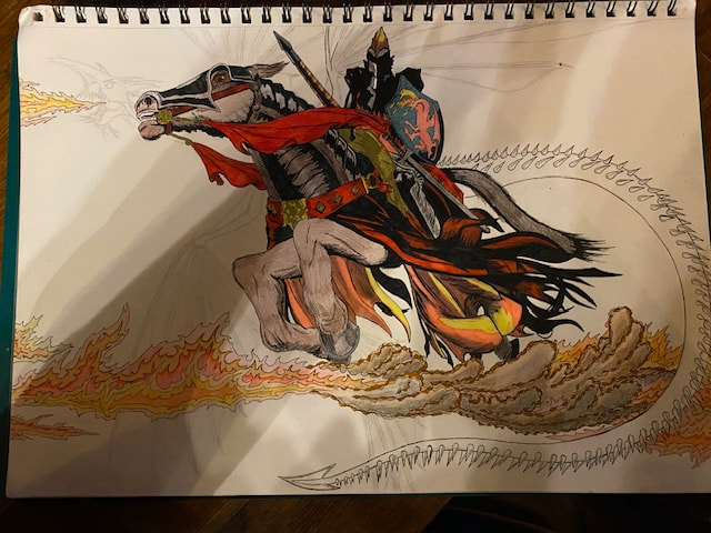Last year, before winter started and got really cold outside a local in Silverdale named Emma, asked me to created a drawing of a knight in dragon armour similar to the last of drawing of the knight in dragon, but better and in full scale (like from head to toe). With this in mind, I came with an idea of what to, but I had to be a little mix-creativity. Photos in Progress: The Knight, with the hose and armour was referenced and inspired from Aerion Targaryen in the "Game of Thrones where he is charging with a war lance in his hand. As for the dragon was reference from "Avatar: Fire and ash", unlike the other flying creatures (called Banshees) the I used is different and quite fierce, to make it more fierce and dragon-like I added in fire coming out of it's mouth and made the tail longer and spike, so that way the creature more like a proper fire-breathing dragon. I added in more fire in the bottom of the background, of the drawing, along dust and ash as the knight is charging through the fire. The final drawing of the Knight in Dragon armour: After the drawing was done, I waited to bump into Emma while I was at work, then last weekend I was final able to give the drawing to her before she had to go home and I'll be waiting to hear it and her the next time I see her.