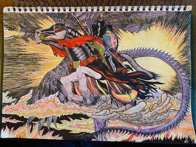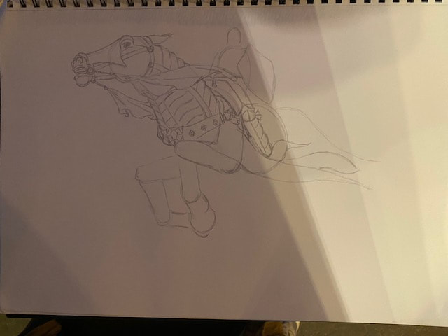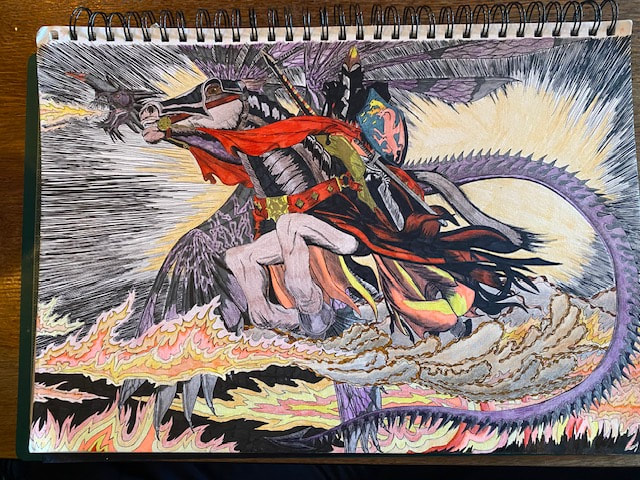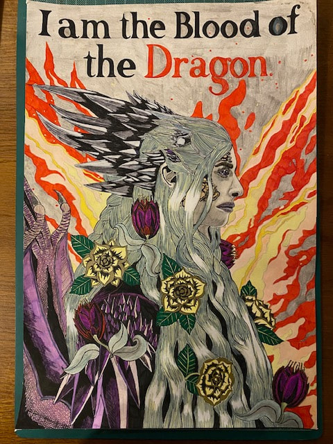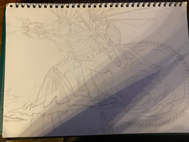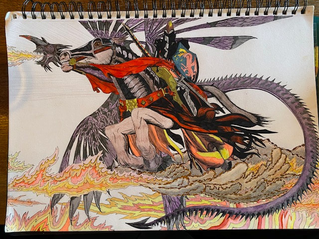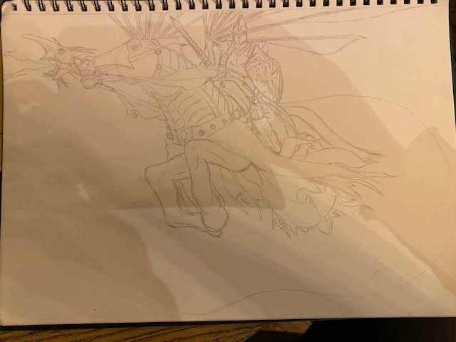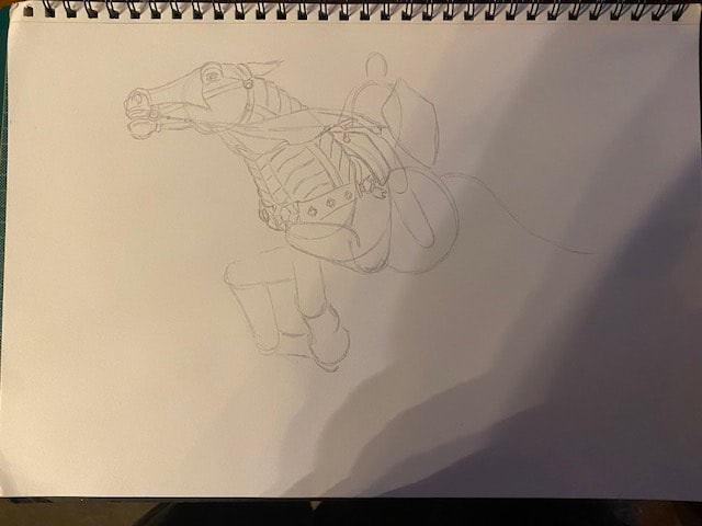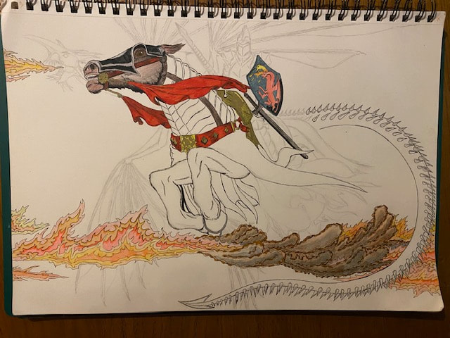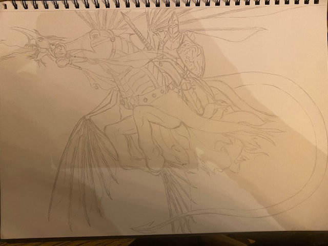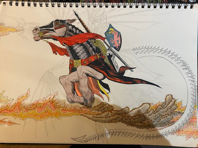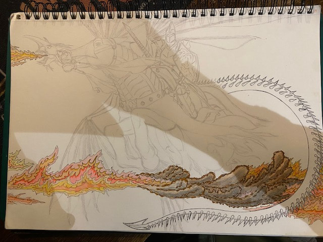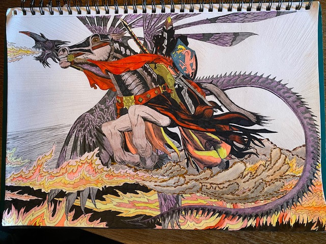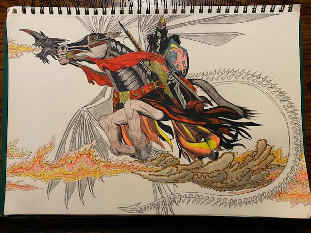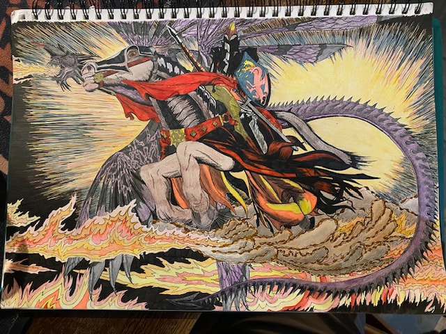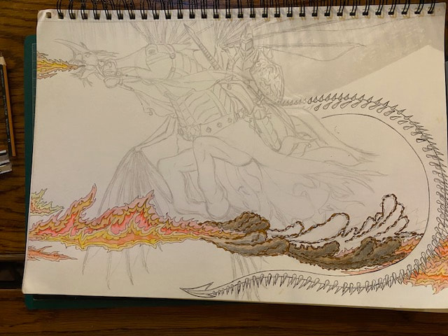 Last year, before winter started and got really cold outside a local in Silverdale named Emma, asked me to created a drawing of a knight in dragon armour similar to the last of drawing of the knight in dragon, but better and in full scale (like from head to toe). With this in mind, I came with an idea of what to, but I had to be a little mix-creativity. Photos in Progress: The Knight, with the hose and armour was referenced and inspired from Aerion Targaryen in the "Game of Thrones where he is charging with a war lance in his hand. As for the dragon was reference from "Avatar: Fire and ash", unlike the other flying creatures (called Banshees) the I used is different and quite fierce, to make it more fierce and dragon-like I added in fire coming out of it's mouth and made the tail longer and spike, so that way the creature more like a proper fire-breathing dragon. I added in more fire in the bottom of the background, of the drawing, along dust and ash as the knight is charging through the fire. The final drawing of the Knight in Dragon armour: After the drawing was done, I waited to bump into Emma while I was at work, then last weekend I was final able to give the drawing to her before she had to go home and I'll be waiting to hear it and her the next time I see her.